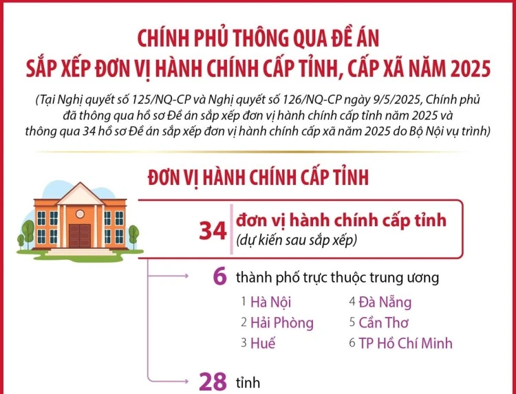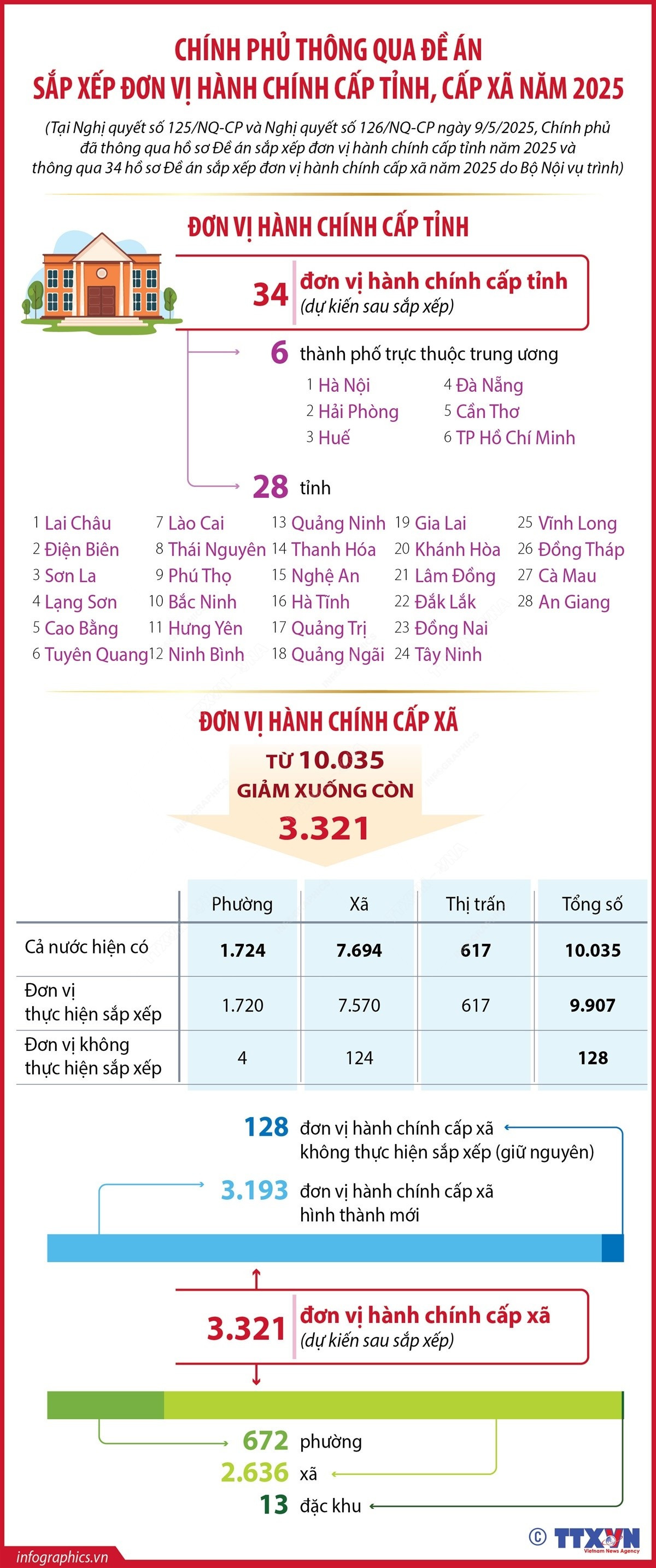 Dự kiến sau khi thực hiện sắp xếp, cả nước có 34 đơn vị hành chính cấp tỉnh, trong đó có 6 thành phố trực thuộc trung ương và 3.321 đơn vị hành chính cấp xã (2.636 xã, 672 phường và 13 đặc khu).