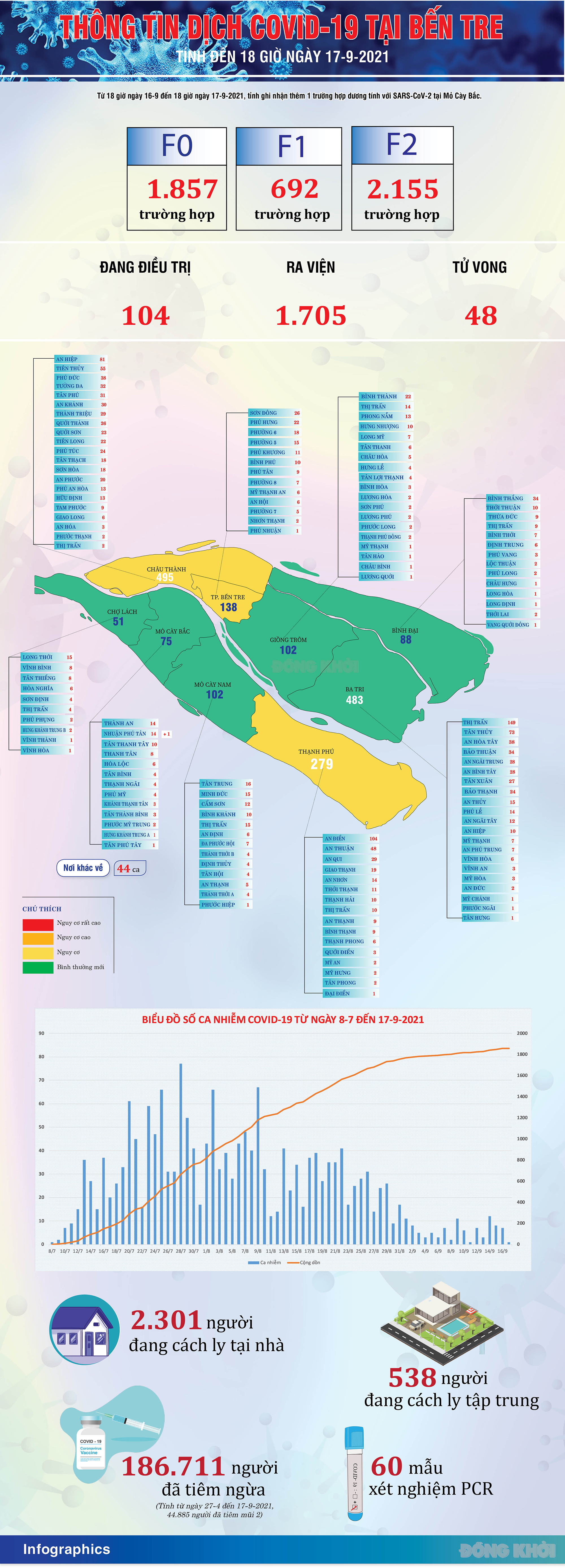 BDK.VN - Từ 18 giờ ngày 16-9 đến 18 giờ ngày 17-9-2021, tỉnh ghi nhận thêm 1 trường hợp dương tính với SARS-CoV-2 tại Mỏ Cày Bắc.