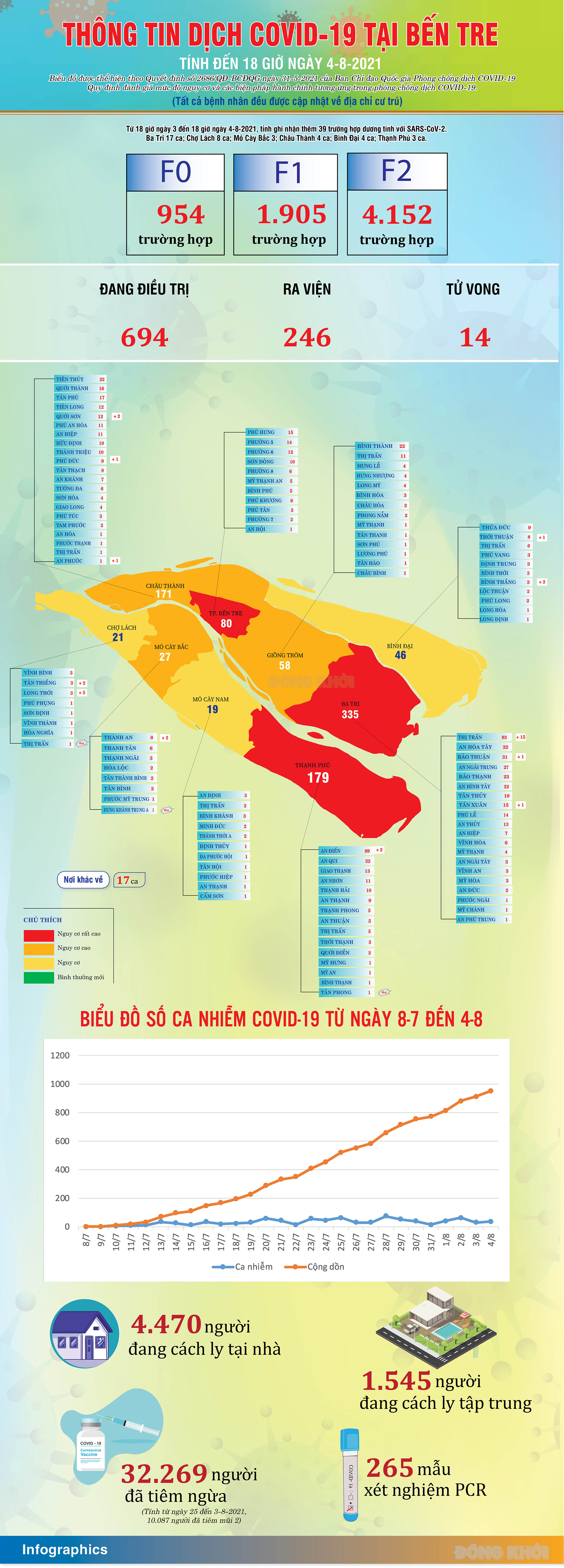 BDK.VN - Từ 18 giờ ngày 3 đến 18 giờ ngày 4-8-2021, tỉnh ghi nhận thêm 39 trường hợp dương tính với SARS-CoV-2. Ba Tri 17 ca; Chợ Lách 8 ca; Mỏ Cày Bắc 3; Châu Thành 4 ca; Bình Đại 4 ca; Thạnh Phú 3 ca.