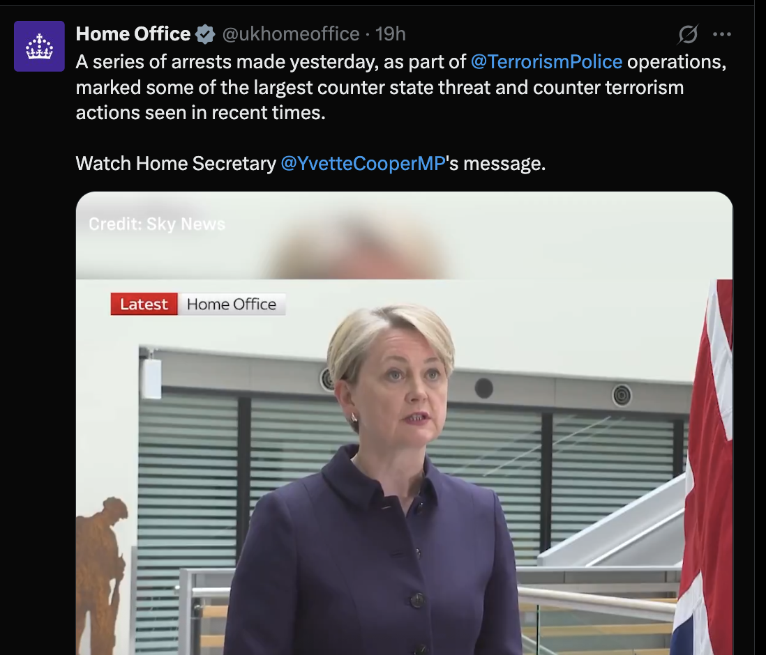 Bộ trưởng Nội vụ Anh, bà Yvette Cooper thông tin về việc lực lượng chức năng nước này phá vỡ một trong “những mối đe doạ khủng bố lớn nhất trong những năm gần đây”. Ảnh chụp màn hình tài khoản mạng xã hội X của Bộ Nội vụ Anh