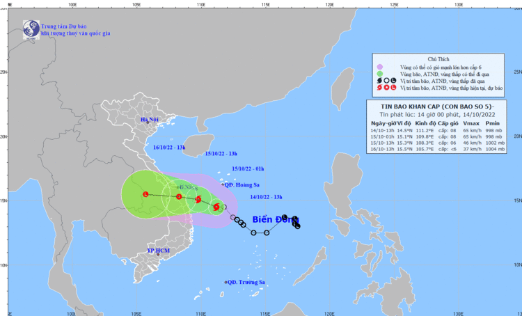 Đến 13 giờ ngày 15-10-2022, bão có khả năng suy yếu thành áp thấp nhiệt đới trên khu vực đất liền các tỉnh Đà Nẵng - Quảng Ngãi; sức gió mạnh cấp 6, giật cấp 8.