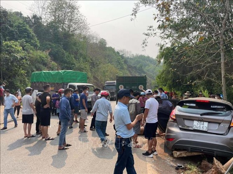 Vụ tai nạn giao thông trên Quốc lộ 6 ngày 11-4-2022 khiến 3 người thương vong, gây ùn tắc giao thông cục bộ gần 1 giờ đồng hồ. Ảnh: TTXVN phát