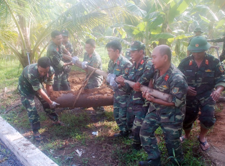 BDK.VN - Ngày 21-5-2018 tại kho đạn tỉnh (xã Tân Phú Tây, huyện Mỏ Cày Bắc), Ban Công binh Bộ Chỉ huy Quân sự tỉnh tiến hành bàn giao 10 quả bom nặng 2.250kg cho Lữ đoàn Công binh 25 thuộc Quân khu 9.