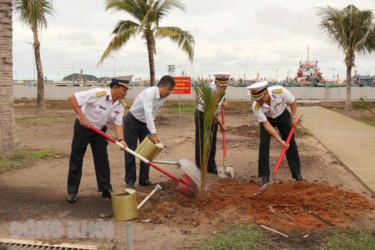 Trưởng ban Tuyên giáo và Dân vận Tỉnh ủy Bùi Văn Bia cùng cán bộ, chiến sĩ Lữ đoàn 127 thực hiện công trình trồng dừa.