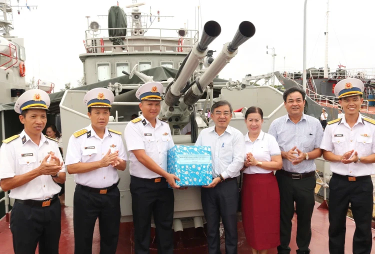 Trưởng ban Tuyên giáo và Dân vận Tỉnh ủyBùi Văn Bia tặng quà cán bộ, chiến sĩ Tàu 253, Hải đội 512, Lữ đoàn 127.