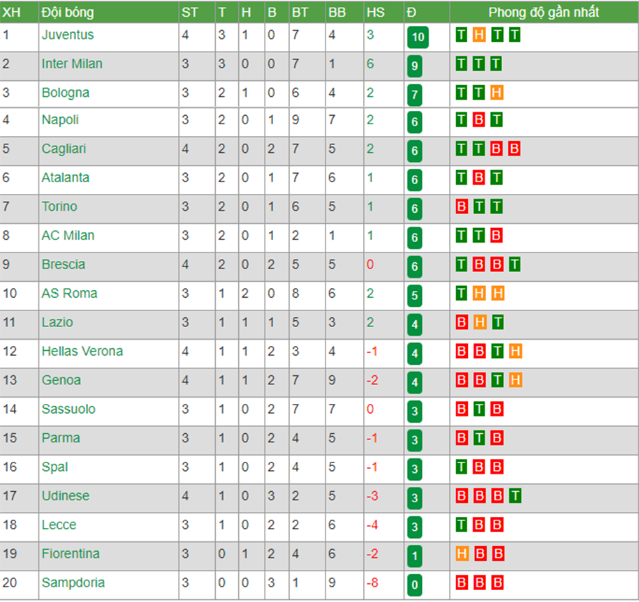 Bảng xếp hạng hạng vòng 4 Serie A 2019/20