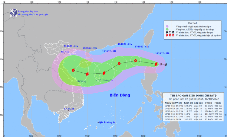Dự báo đến 1 giờ ngày 17-10-2022, bão di chuyển theo hướng Tây Tây Bắc, mỗi giờ đi được 15 km/h, đi vào Biển Đông và có khả năng mạnh thêm, cường độ mạnh cấp 10, giật 12.
