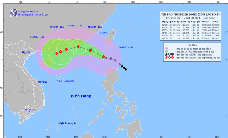 Đến 16 giờ ngày 31-8-2023, vị trí tâm bão ở 21,7 độ Vĩ Bắc-117,5 độ Kinh Đông, trên vùng biển phía Đông Bắc khu vực Bắc Biển Đông, cách Hong Kong (Trung Quốc), khoảng 370km về phía Đông Đông Nam.