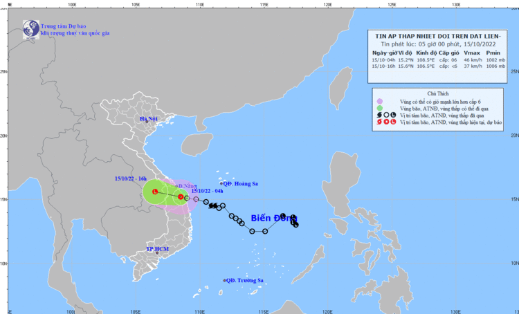 Đến 16 giờ ngày 15-10-2022, áp thấp nhiệt đới sẽ suy yếu thành vùng áp thấp.