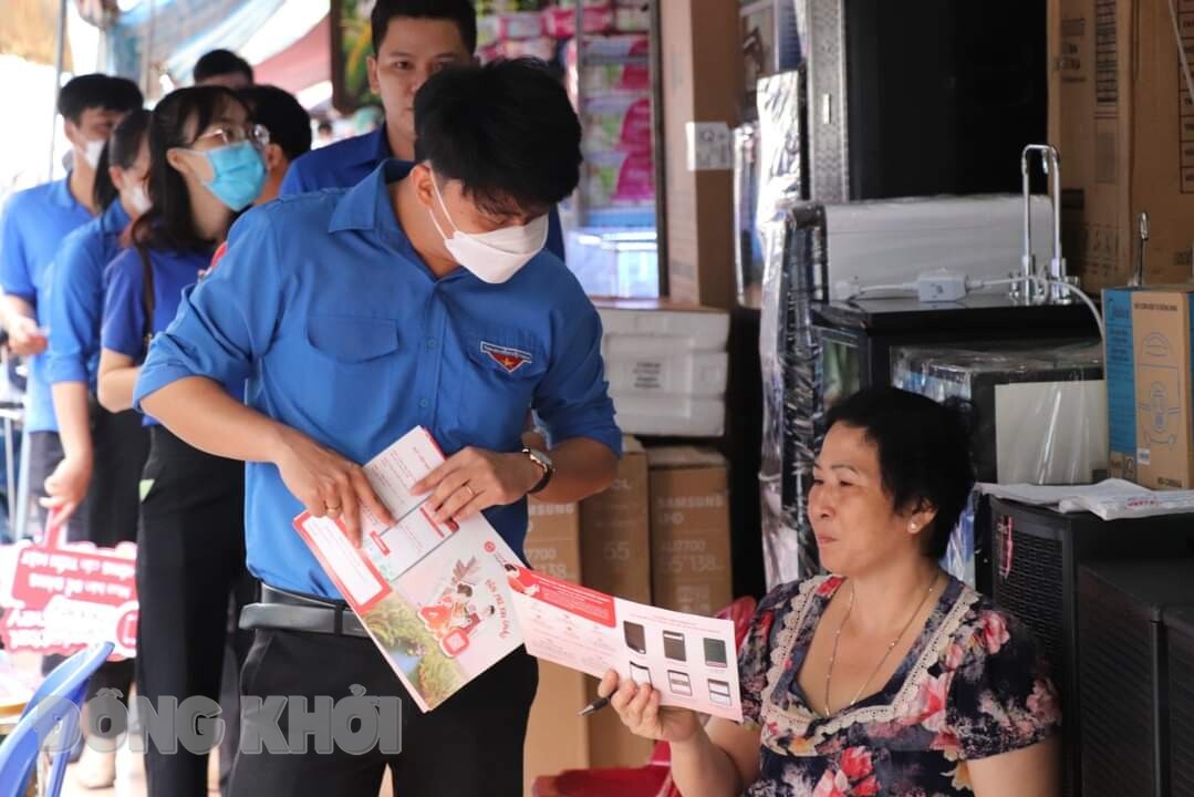 Tuyên truyền, hướng dẫn tiểu thương thực hiện thanh toán không dùng tiền mặt. (Ảnh: CTV)