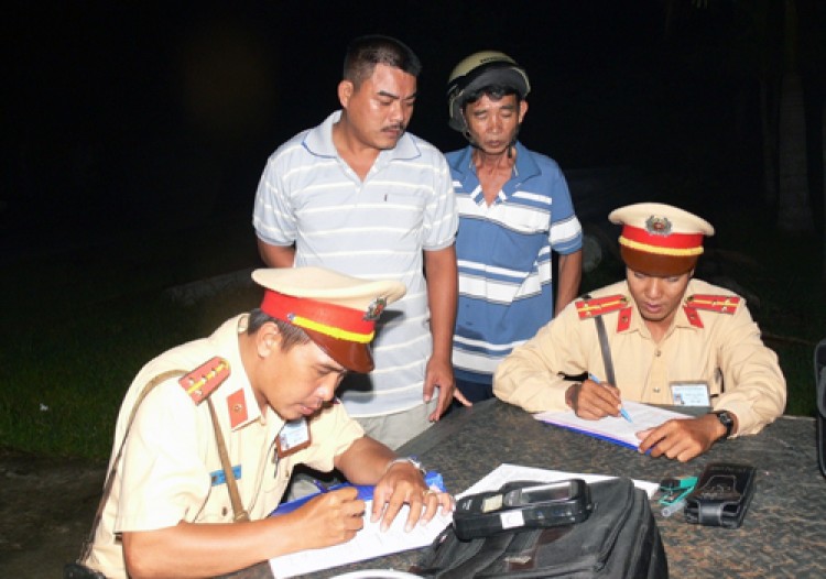 | CSGT xử ly vi phạm nồng độ cồn trên QL.57, đoạn Mỏ Cày Nam. Ảnh: Thu Huyền |