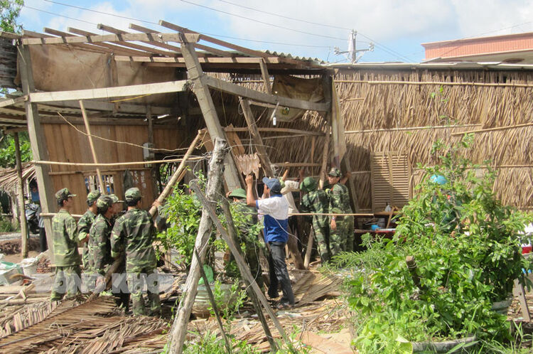 Cán bộ, chiến sĩ lực lượng vũ trang hỗ trợ người dân khắc phục lốc xoáy ở huyện Bình Đại. Ảnh: Đ. Thạch