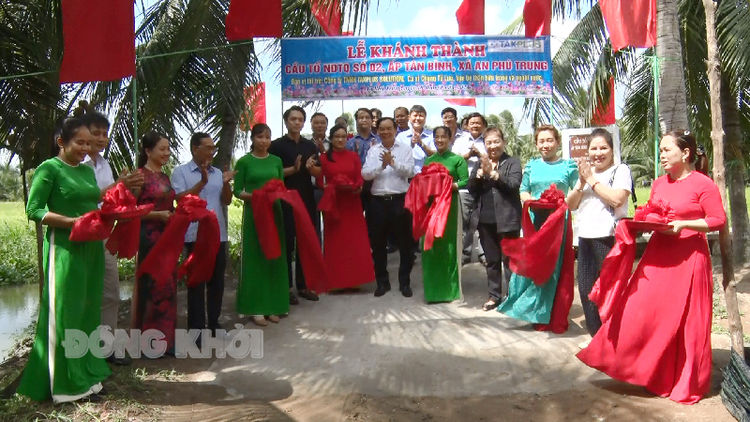 Chủ tịch UBDND tỉnh Trần Ngọc Tam cùng đại biểu cắt băng khánh thành cầu ấp Tân Bình.