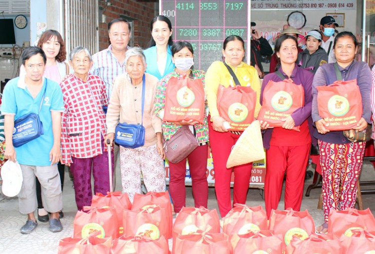Chủ tịch Công ty Xổ số kiến thiết tỉnh Bình Dương Nguyễn Thị Kim Mai (thứ ba, hàng sau) và ông Đặng Minh Sơn trao quà cho người nghèo.