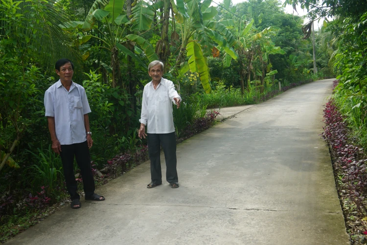Ông Huỳnh Kim Tư (bên phải) cho biết phần đất gia đình hiến tặng để làm đường giao thông nông thôn ấp.