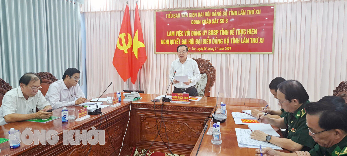 "Đối với đoàn khảo sát số 3 của Tiểu ban Văn kiện Đại hội đại biểu Đảng bộ tỉnh lần thứ XII, cần ghi nhận, tổng hợp kết quả khảo sát đối với Đảng ủy BĐBP tỉnh để tổng hợp chung vào kết quả khảo sát việc thực hiện Nghị quyết Đại hội đại biểu Đảng bộ tỉnh lần thứ XI theo Kế hoạch số 02 của Tiểu ban Văn kiện. Đây là cơ sở rất quan trọng để thực hiện các bước xây dựng văn kiện trình Đại hội đại biểu Đảng bộ tỉnh lần thứ XII, nhiệm kỳ 2025 - 2030. Trên cơ sở kết quả khảo sát, các thành viên Tiểu ban Văn kiện tiếp tục nghiên cứu, tổng hợp, thực hiện nhiệm vụ được phân công, bảo đảm tiến độ xây dựng Văn kiện theo Kế hoạch số 02-KH/TBVK ngày 24-10-2024 của Tiểu ban Văn kiện", Chủ tịch UBND tỉnh Trần Ngọc Tam nhấn mạnh.