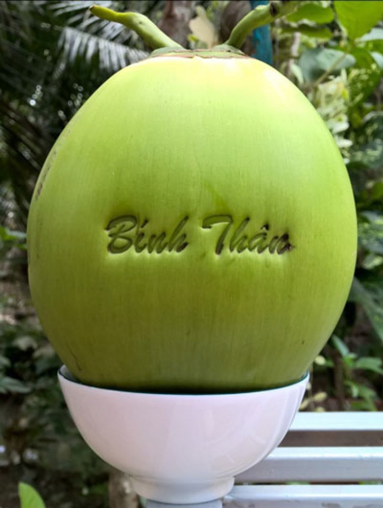 Anh Huỳnh Thanh Tâm, sinh năm 1986, ngụ tại thị trấn Châu Thành, vừa cho ra đời sản phẩm dừa in chữ nghệ thuật: Tài, Lộc, Bính Thân... dùng để làm quà biếu, chưng Tết.