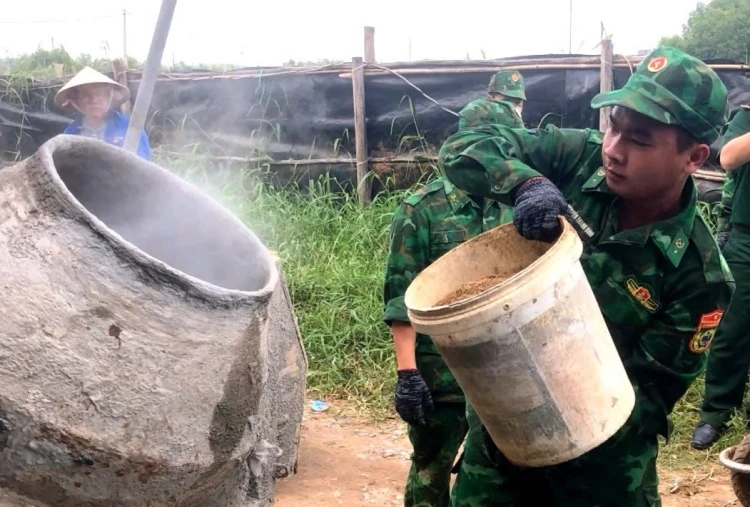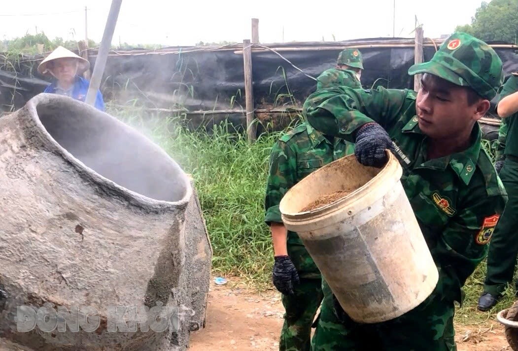 Cán bộ, đoàn viên thanh niên Bộ đội Biên phòng tỉnh thực hiện các công trình phần việc tại xã Thạnh Hải.
