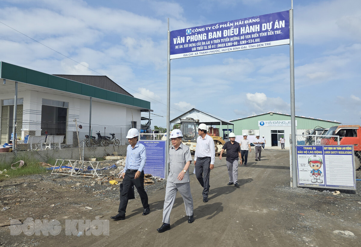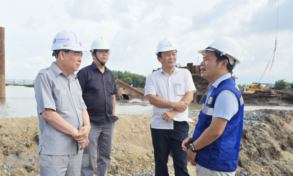 Chủ tịch UBND tỉnh Trần Ngọc Tam cùng đoàn lãnh đạo UBND huyện Bình Đại khảo sát tiến độ dự án cầu Ba Lai 8.