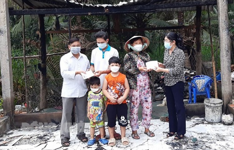 Trao tiền hỗ trợ cho 1 hộ khó khăn trong huyện bị cháy nhà. Ảnh: CTV
