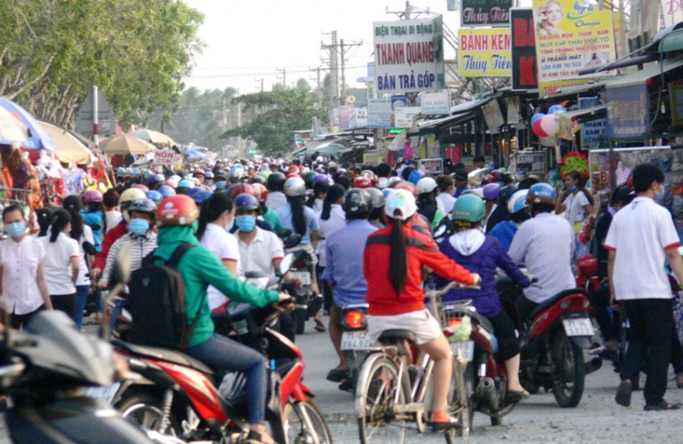 Giờ cao điểm tan ca, công nhân và người buôn bán hai bên đường làm chắn lối đi vào trung tâm xã An Phước.