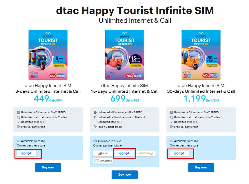 Điển hình là sự hợp tác chiến lược với DTAC - nhà mạng hàng đầu tại Thái Lan. Gigago tự hào là đối tác uy tín của DTAC, mang đến những gói eSIM Thái Lan độc quyền như gói eSIM Data & nghe gọi không giới hạn 8 ngày, 10 ngày, 15 ngày và 30 ngày.