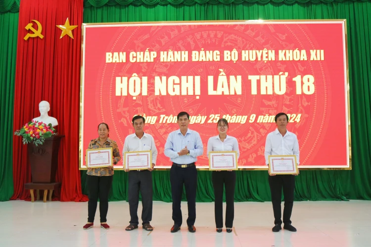 Theo đánh giá của Huyện ủy, trong 9 tháng năm 2024, công tác xây dựng Đảng, hệ thống chính trị trong sạch, vững mạnh được chú trọng. Kinh tế - xã hội của huyện tiếp tục trên đà phục hồi. Kết nạp đảng viên đạt 117,69%; xây dựng 27/15 chi bộ ấp, khu phố đạt trong sạch, vững mạnh toàn diện, đạt 180%; có thêm 4 xã đạt chuẩn nông mới (NTM), 1 xã đạt chuẩn NTM nâng cao, 2 xã đạt chuẩn NTM kiểu mẫu; giải quyết việc làm mới đạt 91,18%, đưa lao động làm việc có thời hạn ở nước ngoài theo hợp đồng đạt 120%, giao quân đạt 100%, tổ chức thành công diễn tập khu vực phòng thủ cấp huyện năm 2024…