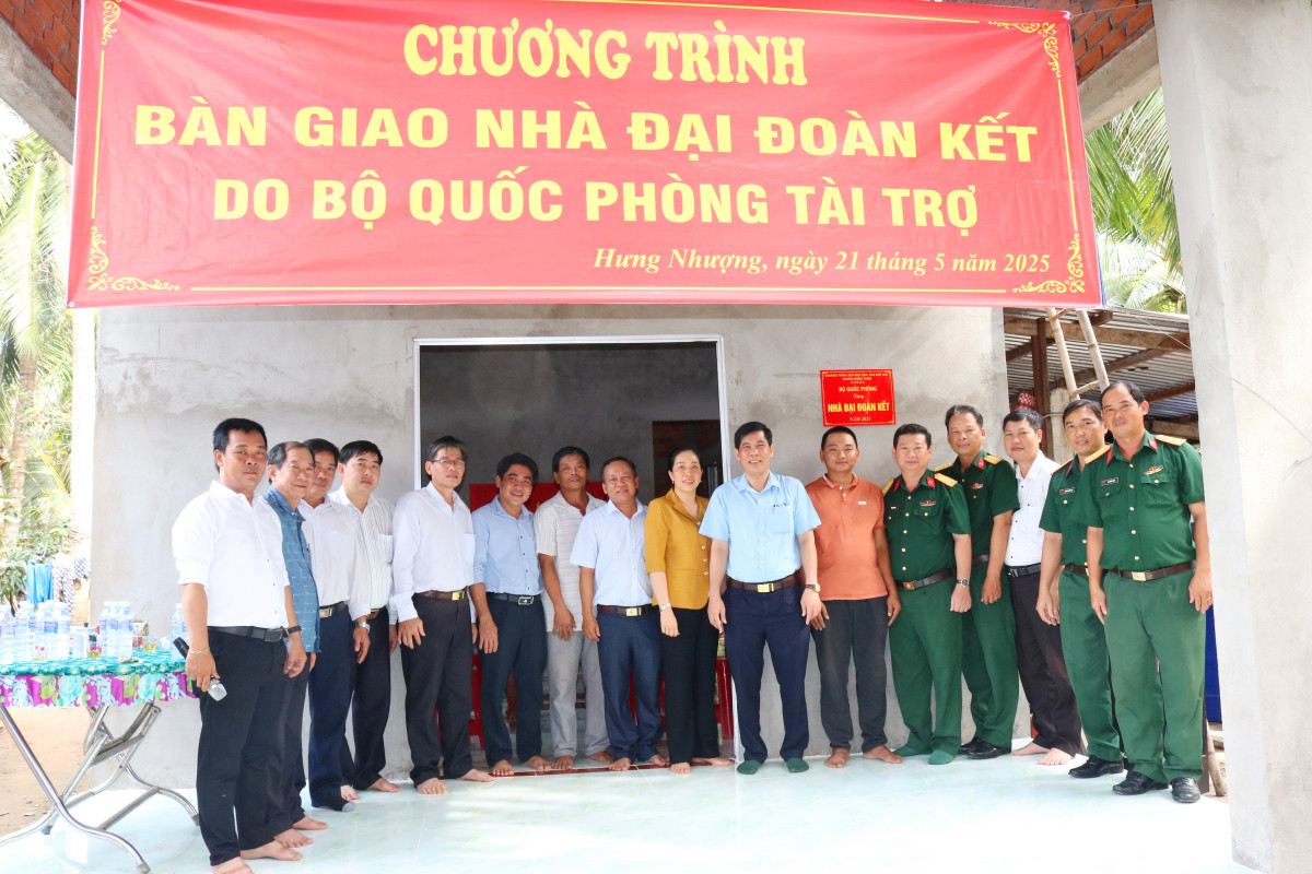 Lãnh đạo tỉnh, huyện, xã chụp hình lưu niệm tại lễ bàn giao nhà cho anh Trần Công Hậu, ấp Hưng An Tây, xã Hưng Nhượng (Giồng Trôm).
