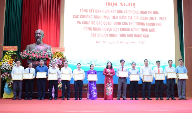 Đến nay, tỉnh có 124/132 xã đạt chuẩn NTM (đạt 95,5%), đạt 119,3% so với mục tiêu của tỉnh và so với chỉ tiêu Trung ương giao (80%). Trong đó, có 54 xã NTM nâng cao (đạt 42,9%), đạt 107,25% so với mục tiêu của tỉnh và so với chỉ tiêu Trung ương giao (40%); 28 xã NTM kiểu mẫu (đạt 22,2% so với xã đạt chuẩn NTM, vượt chỉ tiêu của tỉnh là mỗi huyện, thành phố có 1 xã), đạt 341,5% so với chỉ tiêu Trung ương giao (6,5%). Tỉnh có 7/9 huyện, thành phố đạt chuẩn, hoàn thành nhiệm vụ xây dựng NTM (TP. Bến Tre và các huyện: Chợ Lách, Mỏ Cày Nam, Châu Thành, Mỏ Cày Bắc, Thạnh Phú, Bình Đại), đạt 116,7% so với mục tiêu của tỉnh và so với chỉ tiêu Trung ương giao (mục tiêu 6 huyện); 1 huyện đạt chuẩn NTM nâng cao (Chợ Lách), đạt 100% so với mục tiêu của tỉnh và so với chỉ tiêu Trung ương giao.