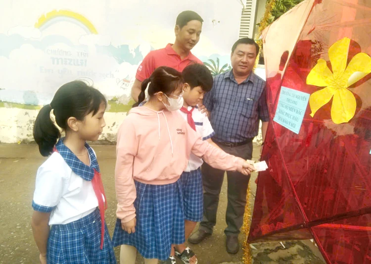 Các em học sinh Trường Tiểu học Nguyễn Thị Lang quyên góp ủng hộ đồng bào miền Bắc khắc phục hậu quả bão Yagi.