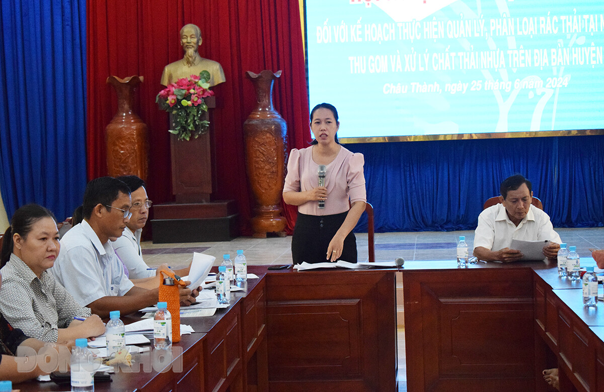 Chủ tịch Hội Liên hiệp Phụ nữ huyện Châu Thành Nguyễn Thanh Hiền phát biểu kết luận tại hội nghị phản biện dự thảo kế hoạch thực hiện quản lý, phân loại rác thải tại nguồn, thu gom và xử lý chất thải nhựa trên địa bàn huyện.