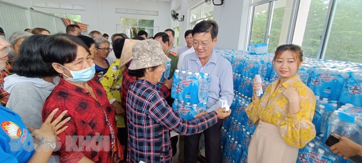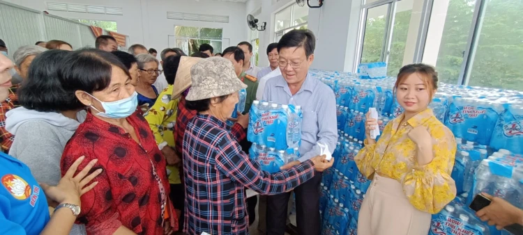 Tặng nước uống cho người dân bị ảnh hưởng bởi hạn hán, xâm nhập mặn tại xã An Khánh, huyện Châu Thành.