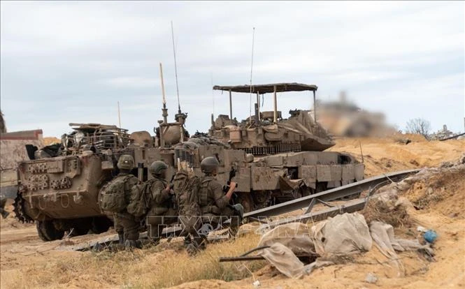 Binh sĩ và xe quân sự Israel được triển khai tại Dải Gaza ngày 18-4-2025. Ảnh: THX/TTXVN
