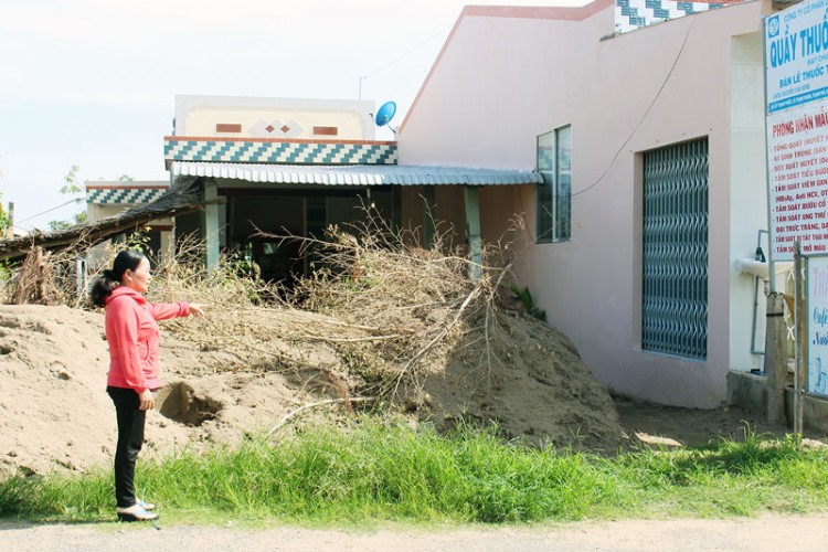 Bà N.T.Ch. đứng trước nhà đã bị bà N. đổ đống đất chắn ngang. Ảnh: PV