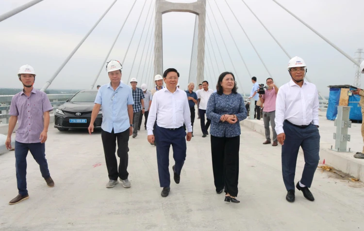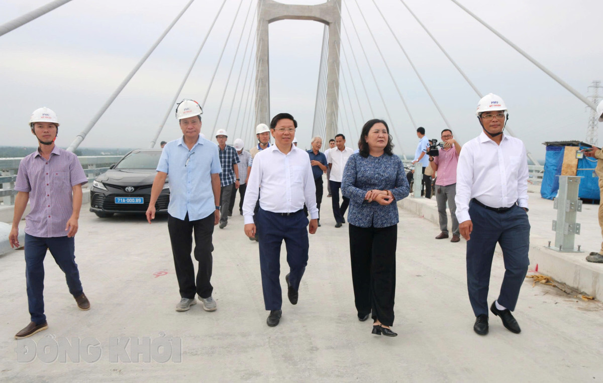 Bí thư Tỉnh ủy - Chủ tịch HĐND tỉnh Hồ Thị Hoàng Yến và Phó Bí thư Thường trực Tỉnh ủy Trần Thanh Lâm phấn khởi trước tiến độ của công trình dự án cầu Rạch Miễu 2.