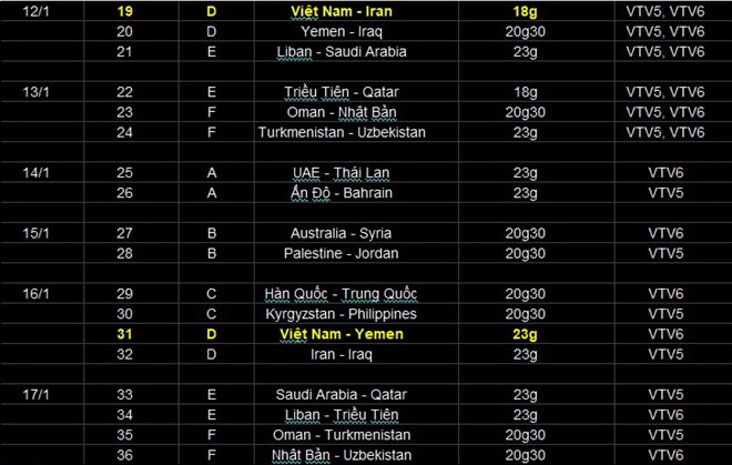 Theo lịch thi đấu, đoàn quân của huấn luyện viên Park Hang-seo sẽ lần lượt gặp đội tuyển Iraq (ngày 8-1), đội tuyển Iran (12-1) và khép lại vòng bảng gặp Yemen (16-1).