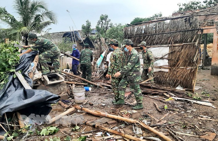 Lực lượng dân quân huyện Chợ Lách giúp người dân sửa chữa nhà bị sập do lốc xoáy.