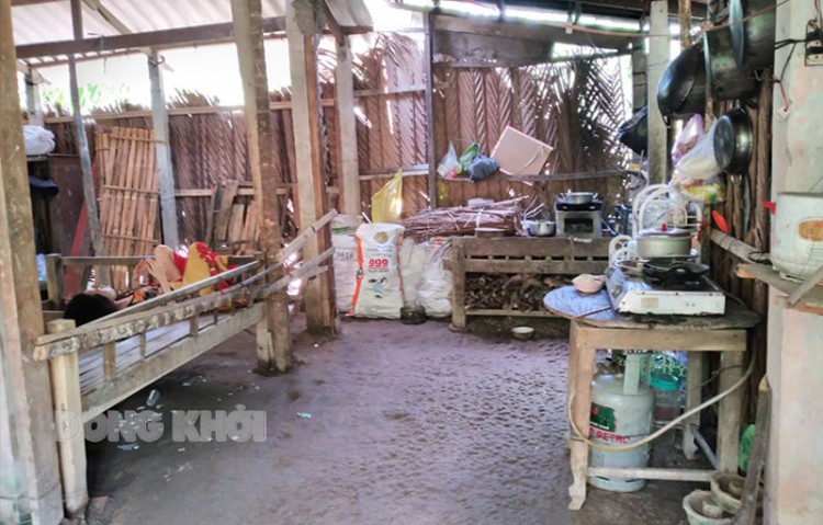 Bà Diệu cho hay: “Nhà này được xây cất hơn 40 năm của bà ngoại để lại cho tôi. Hoàn cảnh kinh tế khó khăn nên tôi che chắn tạm để ở”. Bà Diệu có người con gái (chị T) bị bệnh tâm thần đã hơn 10 năm qua. T không thể tự lo sinh hoạt cá nhân được, mọi thứ đều phải nhờ vào bà Diệu. Thu nhập chính của gia đình nhờ vào tiền chạy xe ôm của bà Diệu và khoản trợ cấp xã hội được hưởng hàng tháng của chị T. Những lúc không có khách, bà Diệu xin tàu lá dừa khô rụng của các chủ vườn để chuốt lấy cọng bán cho các điểm làm chổi.