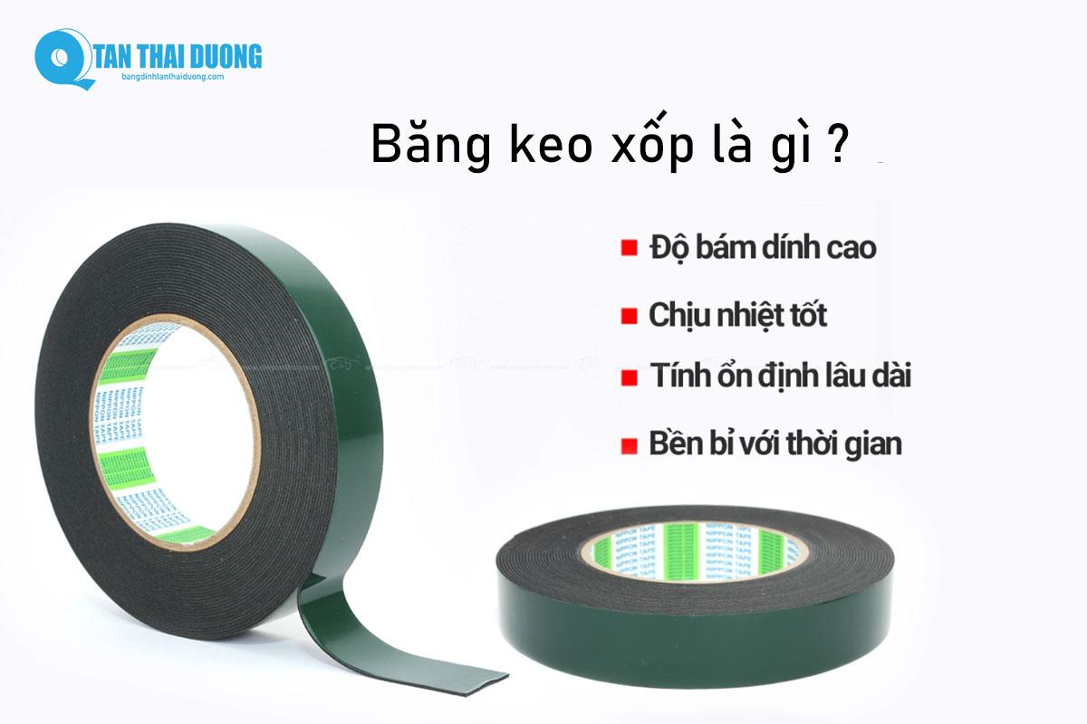 Băng keo xốp (hay còn gọi là băng dính xốp) là loại băng keo 2 mặt có cấu tạo đặc biệt khi lớp giữa 2 mặt keo được làm từ xốp. Khác với những loại băng keo 2 mặt thông thường thì ở cả hai mặt keo của băng keo đều được phủ một lớp giấy chống dính. Khi sử dụng, chỉ cần dùng kéo cắt keo ra và lột bỏ phần giấy đi.