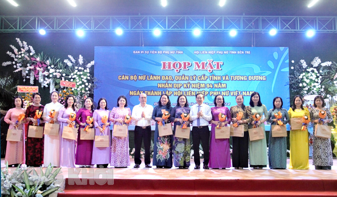 Ban Vì sự tiến bộ của PN tỉnh phối hợp với Ban Thường vụ Hội LHPN tỉnh vừa tổ chức họp mặt nữ cán bộ quản lý cấp tỉnh và tương đương nhân kỷ niệm 94 năm Ngày thành lập Hội LHPN Việt Nam (20-10-1930 - 20-10-2024), tại Du lịch sinh thái Lan Vương (TP. Bến Tre). Tham dự có Quyền Bí thư Tỉnh ủy - Chủ tịch HĐND tỉnh Hồ Thị Hoàng Yến, Chủ tịch UBND tỉnh Trần Ngọc Tam, Chủ nhiệm Ủy ban Kiểm tra Tỉnh ủy Nguyễn Hải Châu, Trưởng ban Tuyên giáo Tỉnh ủy Nguyễn Trúc Hạnh, Bí thư Thành ủy TP. Bến Tre Nguyễn Văn Tuấn, Phó chủ tịch UBND tỉnh Nguyễn Thị Bé Mười, Chủ tịch Hội LHPN tỉnh Nguyễn Thị Kim Thoa cùng đông đảo cán bộ lãnh đạo các sở, ban ngành, đoàn thể tỉnh và tương đương.