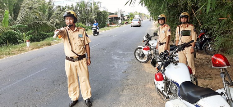 Trung tá Trần Bá Nhân (bìa trái) đang tuần tra, kiểm soát giao thông trên tỉnh lộ 882.