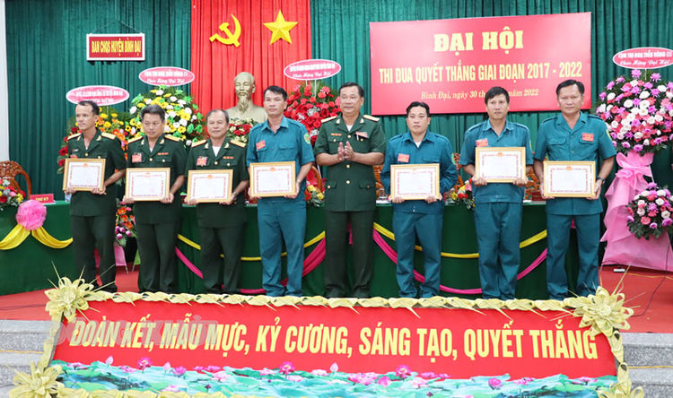 Trung tá quân nhân chuyên nghiệp Nguyễn Văn Đùng (thứ ba, trái sang) nhận giấy khen của UBND huyện Bình Đại trong Đại hội thi đua Quyết thắng lực lượng vũ trang huyện giai đoạn 2017 - 2022. Ảnh: Bùi Linh