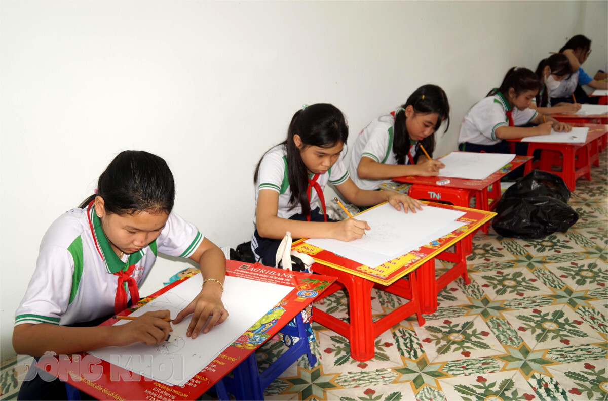 Các em học sinh tham gia hội thi vẽ tranh chủ đề “Thiếu nhi Bến Tre - Vâng lời Bác Hồ dạy”.