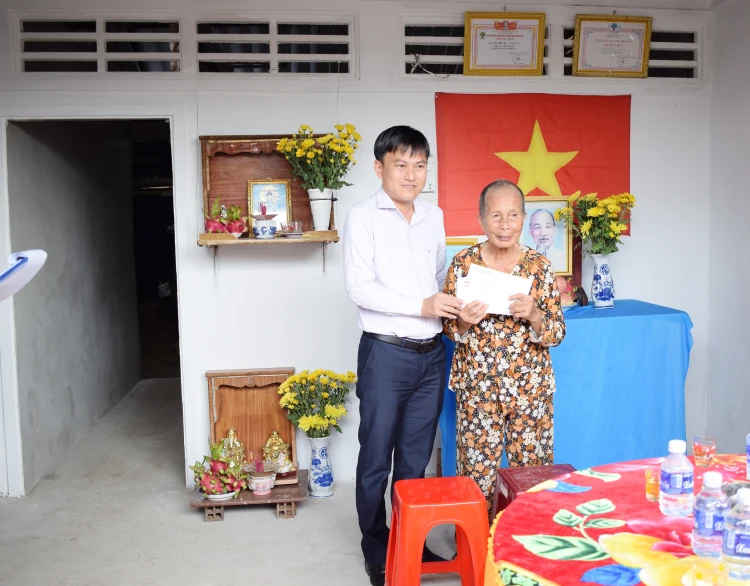 Bí thư Huyện ủy Mỏ Cày Nam Hà Quốc Cường trao quà cho hộ bà Lê Thị Tự, ấp Hội An, xã Đa Phước Hội (Mỏ Cày Nam) nhân lễ bàn giao nhà.
