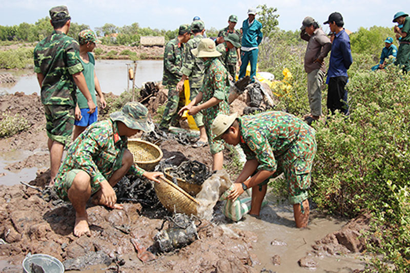 Lực lượng quân sự huyện Bình Đại và Bộ chỉ huy Quân sự tỉnh Bến Tre thu thập các mảnh vỡ của xác máy bay.