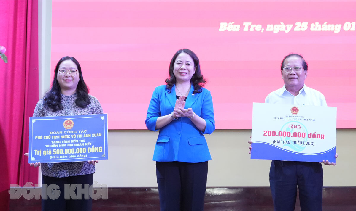 Phó chủ tịch nước Võ Thị Ánh Xuân trao tặng nhà Đại đoàn kết và Quỹ bảo trợ trẻ em cho tỉnh. Ảnh: CTV