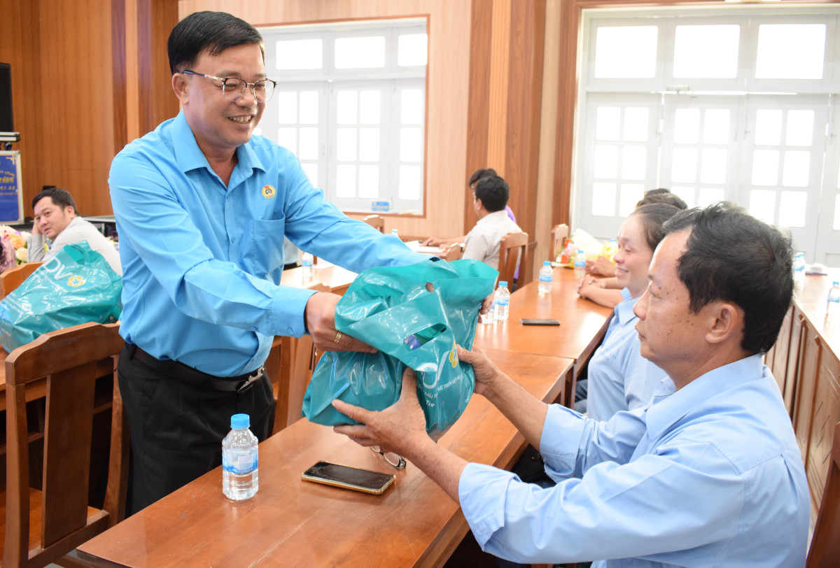 Phó chủ tịch Thường trực Liên đoàn Lao động tỉnh Huỳnh Văn Tấn trao quà cho người lao động trong các doanh nghiệp trên địa bàn huyện Châu Thành.