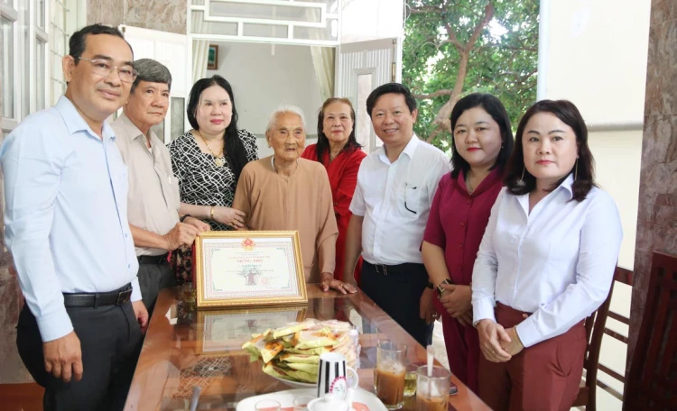 Đoàn đến thăm và chúc thọ cụ bà Nguyễn Thị Cơi, 90 tuổi, ngụ khu phố An Thạnh, thị trấn Tiệm Tôm. Ảnh: Thạch Thảo