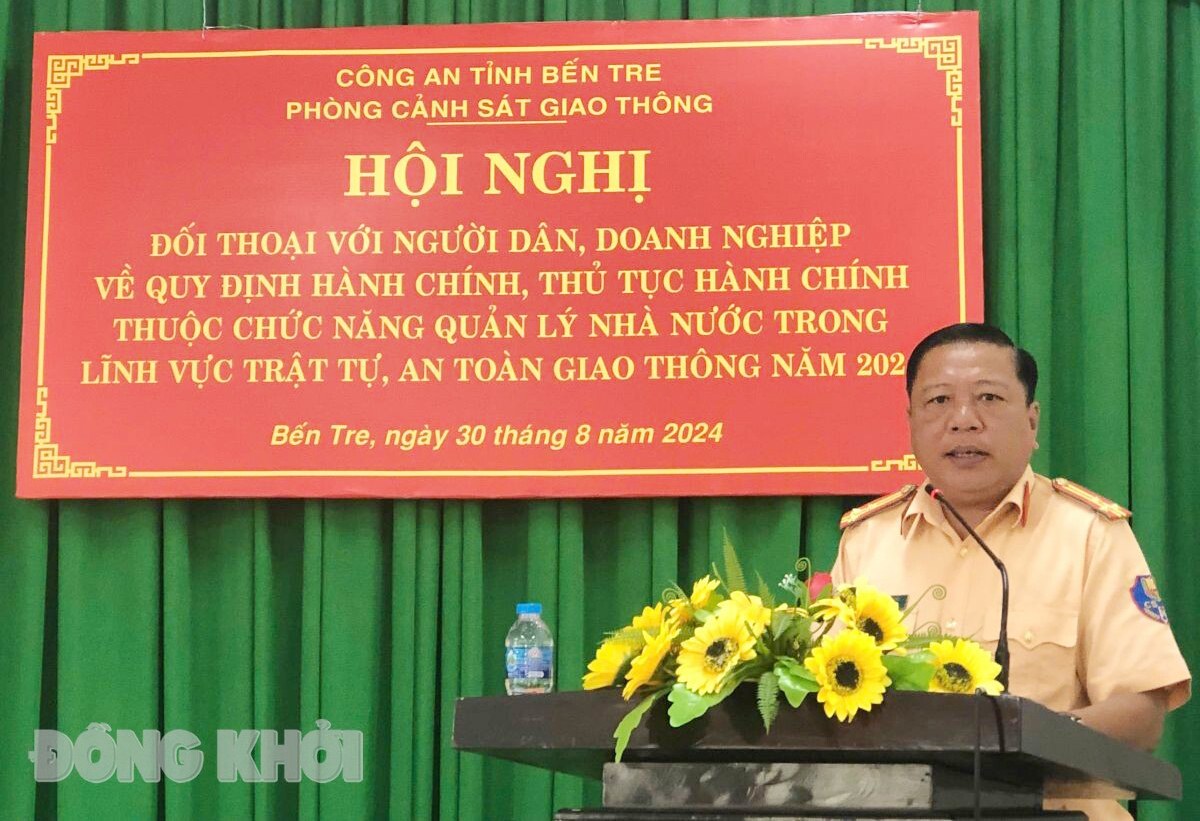 Thượng tá Võ Văn Nghĩa - Trưởng phòng Cảnh sát giao thông Công an tỉnh cho biết: Với mục đích, tinh thần “lấy Nhân dân là chủ thể, là trung tâm trong công tác của lực lượng Cảnh sát giao thông”, nhằm bảo về quyền, lợi ích của Nhân dân khi tham gia giao thông và lắng nghe, giải đáp, tháo gỡ những khó khăn, vướng mắc, bất cập trong quá trình tham gia giao thông của các cơ quan, doanh nghiệp và người dân trên địa bàn tỉnh nên Phòng Cảnh sát giao thông đã tổ chức hội nghị đối thoại với doanh nghiệp, người dân về thủ tục hành chính.