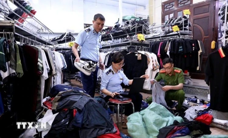 Lực lượng quản lý thị trường tỉnh Tuyên Quang kiểm tra, lập biên bản một cửa hàng kinh doanh quần áo có dấu hiệu giả mạo nhãn hiệu tại phường Minh Xuân, thành phố Tuyên Quang. (Ảnh: Quang Cường/TTXVN)